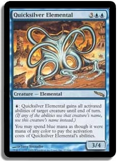 U: Quicksilver Elemental gains all activated abilities of target creature until end of turn. (If any of the abilities use that creature's name, use this creature's name instead.) You may spend blue mana as though it were mana of any color to pay the activation costs of Quicksilver Elemental's abilities.