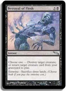 Choose one %EF%BF%BD Destroy target creature; or return target creature card from your graveyard to play. Entwine%EF%BF%BDSacrifice three lands. (Choose both if you pay the entwine cost.)