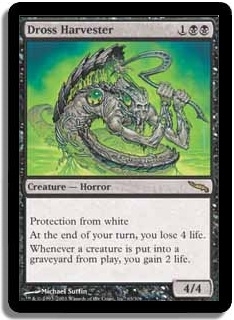 Protection from white At the end of your turn, you lose 4 life. Whenever a creature is put into a graveyard from play, you gain 2 life.