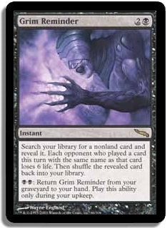 Search your library for a nonland card and reveal it. Each opponent who played a card this turn with the same name as that card loses 6 life. Then shuffle the revealed card back into your library. BB: Return Grim Reminder from your graveyard to your hand. Play this ability only during your upkeep.