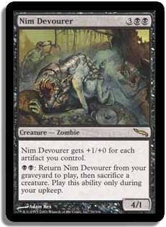 Nim Devourer gets +1/+0 for each artifact you control. BB: Return Nim Devourer from your graveyard to play, then sacrifice a creature. Play this ability only during your upkeep.