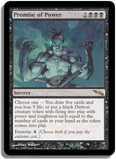 Choose one %EF%BF%BD You draw five cards and you lose 5 life; or put a black Demon creature token with flying into play with power and toughness each equal to the number of cards in your hand as the token comes into play. Entwine 4 (Choose both if you pay the entwine cost.)