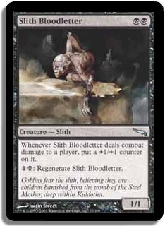 Whenever Slith Bloodletter deals combat damage to a player, put a +1/+1 counter on it. 1B: Regenerate Slith Bloodletter.