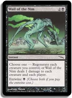Choose one %EF%BF%BD Regenerate each creature you control; or Wail of the Nim deals 1 damage to each creature and each player. Entwine B (Choose both if you pay the entwine cost.)