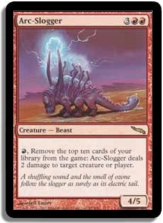 R, Remove the top ten cards of your library from the game: Arc-Slogger deals 2 damage to target creature or player.