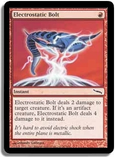 Electrostatic Bolt deals 2 damage to target creature. If it's an artifact creature, Electrostatic Bolt deals 4 damage to it instead.