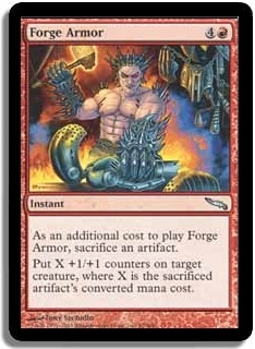 As an additional cost to play Forge Armor, sacrifice an artifact. Put X +1/+1 counters on target creature, where X is the sacrificed artifact's converted mana cost.