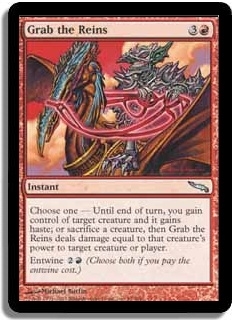 Choose one %EF%BF%BD Until end of turn, you gain control of target creature and it gains haste; or sacrifice a creature, then Grab the Reins deals damage equal to that creature's power to target creature or player. Entwine 2R (Choose both if you pay the entwine cost.)