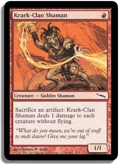 Sacrifice an artifact: Krark-Clan Shaman deals 1 damage to each creature without flying.