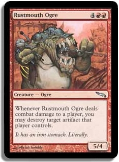 Whenever Rustmouth Ogre deals combat damage to a player, you may destroy target artifact that player controls.