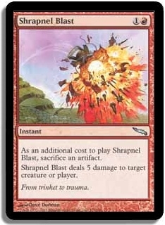 As an additional cost to play Shrapnel Blast, sacrifice an artifact. Shrapnel Blast deals 5 damage to target creature or player.