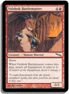 Haste When Vulshok Battlemaster comes into play, attach all Equipment in play to it. (Control of the Equipment doesn't change.)