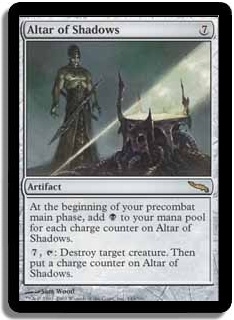 At the beginning of your precombat main phase, add B to your mana pool for each charge counter on Altar of Shadows. 7, T: Destroy target creature. Then put a charge counter on Altar of Shadows.