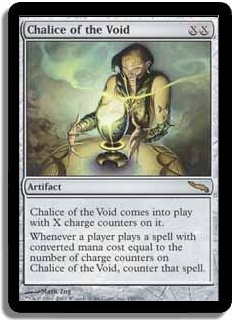 Chalice of the Void comes into play with X charge counters on it. Whenever a player plays a spell with converted mana cost equal to the number of charge counters on Chalice of the Void, counter that spell.