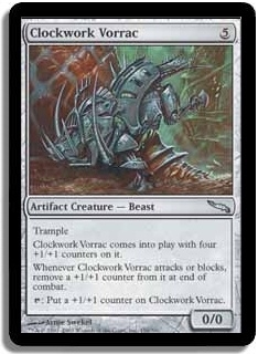 Trample Clockwork Vorrac comes into play with four +1/+1 counters on it. Whenever Clockwork Vorrac attacks or blocks, remove a +1/+1 counter from it at end of combat. T: Put a +1/+1 counter on Clockwork Vorrac.