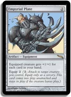Equipped creature gets +1/+1 for each card in your hand. Equip 2 (2: Attach to target creature you control. Equip only as a sorcery. This card comes into play unattached and stays in play if the creature leaves play.)