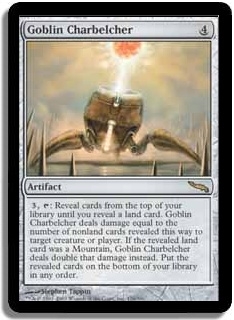 3, T: Reveal cards from the top of your library until you reveal a land card. Goblin Charbelcher deals damage equal to the number of nonland cards revealed this way to target creature or player. If the revealed land card was a Mountain, Goblin Charbelcher deals double that damage instead. Put the revealed cards on the bottom of your library in any order.