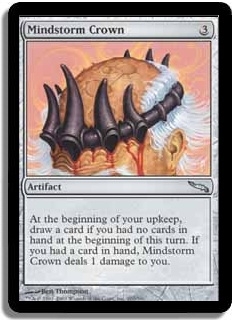 At the beginning of your upkeep, draw a card if you had no cards in hand at the beginning of this turn. If you had a card in hand, Mindstorm Crown deals 1 damage to you.