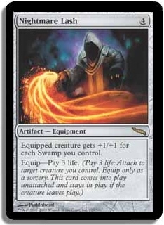 Equipped creature gets +1/+1 for each Swamp you control. Equip%EF%BF%BDPay 3 life. (Pay 3 life: Attach to target creature you control. Equip only as a sorcery. This card comes into play unattached and stays in play if the creature leaves play.)