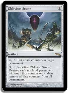 4, T: Put a fate counter on target permanent. 5, T, Sacrifice Oblivion Stone: Destroy each nonland permanent without a fate counter on it, then remove all fate counters from all permanents.