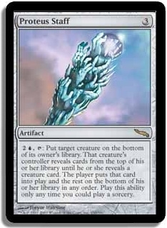 2U, T: Put target creature on the bottom of its owner's library. That creature's controller reveals cards from the top of his or her library until he or she reveals a creature card. The player puts that card into play and the rest on the bottom of his or her library in any order. Play this ability only any time you could play a sorcery.