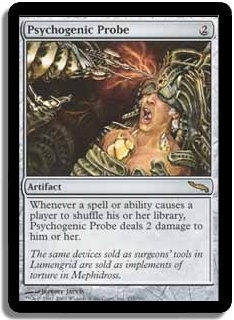 Whenever a spell or ability causes a player to shuffle his or her library, Psychogenic Probe deals 2 damage to him or her.