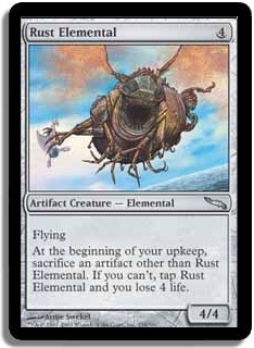 Flying At the beginning of your upkeep, sacrifice an artifact other than Rust Elemental. If you can't, tap Rust Elemental and you lose 4 life.