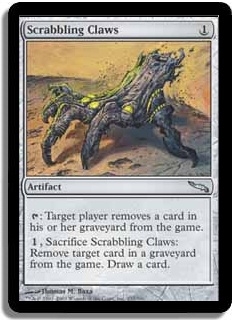 T: Target player removes a card in his or her graveyard from the game. 1, Sacrifice Scrabbling Claws: Remove target card in a graveyard from the game. Draw a card.