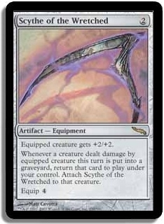 Equipped creature gets +2/+2. Whenever a creature dealt damage by equipped creature this turn is put into a graveyard, return that card to play under your control. Attach Scythe of the Wretched to that creature. Equip 4
