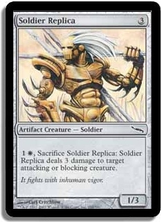 1W, Sacrifice Soldier Replica: Soldier Replica deals 3 damage to target attacking or blocking creature.