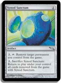 2, T: Remove target permanent you control from the game. 2, Sacrifice Synod Sanctum: Return to play under your control all cards removed from the game with Synod Sanctum.
