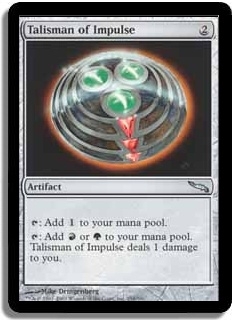 T: Add 1 to your mana pool. T: Add R or G to your mana pool. Talisman of Impulse deals 1 damage to you.