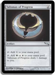 T: Add 1 to your mana pool. T: Add W or U to your mana pool. Talisman of Progress deals 1 damage to you.