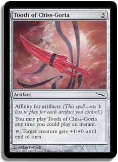 Affinity for artifacts (This spell costs 1 less to play for each artifact you control.) You may play Tooth of Chiss-Goria any time you could play an instant. T: Target creature gets +1/+0 until end of turn.