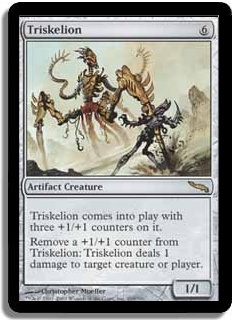 Triskelion comes into play with three +1/+1 counters on it. Remove a +1/+1 counter from Triskelion: Triskelion deals 1 damage to target creature or player.