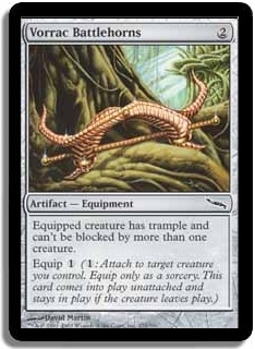 Equipped creature has trample and can't be blocked by more than one creature. Equip 1 (1: Attach to target creature you control. Equip only as a sorcery. This card comes into play unattached and stays in play if the creature leaves play.)