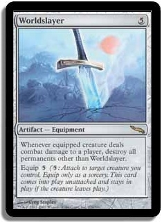 Whenever equipped creature deals combat damage to a player, destroy all permanents other than Worldslayer. Equip 5 (5: Attach to target creature you control. Equip only as a sorcery. This card comes into play unattached and stays in play if the creature leaves play.)