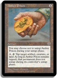 You may choose not to untap Amber prison during your untap phase. <4,T>: Tap target artifact, creature or land. As long as Amber Prison remains tapped, that permanent does not untap during its controller's untap phase.