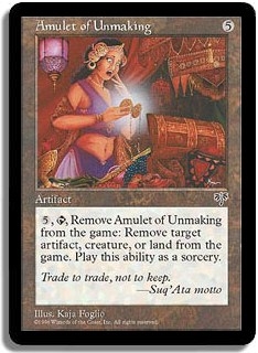 <5,T>: Remove Amulet of Unmaking from the game: Remove target artifact, creature or land from the game. Play this ability as a sorcery.