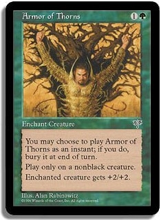 You may choose to play Armor of Thorns as an instant; if you do, bury it at end of turn. Play only on a non-black creature. Enchanted creature gets +2/+2.