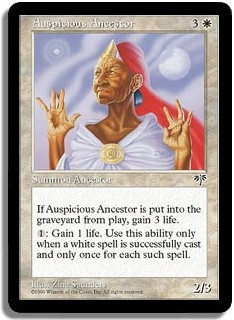 If Auspicious Ancestor is put into the graveyard from play, gain 3 life. <1>: Gain 1 life. Use this ability only when a white spell is successfully cast and only once for each such spell.