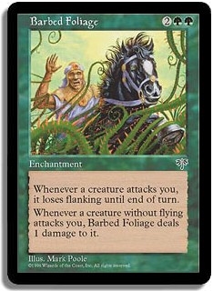Whenever a creature attacks you, it loses flanking until end of turn. Whenever a creature without flying attacks you, Barbed Foliage deals 1 damage to it.
