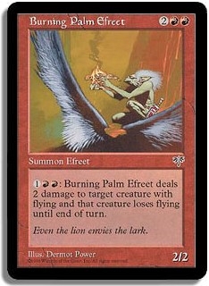 <1RR>: Burning Palm Efreet deals 2 damage to target creature with flying and that creature loses flying until end of turn.