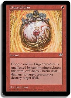Choose one - Target creature is unaffected by summoning sickness this turn; or Chaos Charm deals 1 damage to target creature; or destroy target wall.
