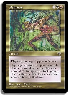 Play only on target opponent's turn. Tap target creature that player controls. That creature deals to the player an amount of damage equal to its power. The creature neither deals nor receives combat damage this turn.