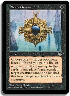 Choose one - Target opponent loses 1 life and you gain 1 life; or remove from the game up to three cards in any player's graveyard; or target creature cannot be blocked this turn except by artifact or black creatures.