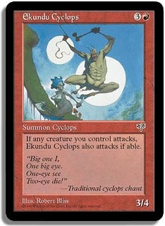 If any creature you control attacks, Ekundu Cyclops also attacks if able.