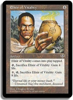 Elixir of Vitality comes into play tapped. <T,Sacrifice Elixir of Vitality>: Gain 4 life. <8,T, Sacrifice Elixir of Vitality>: Gain 8 life.