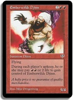 Flying. During each player's upkeep, he or she may pay <RR> or 2 life to gain control of Emberwilde Djinn.