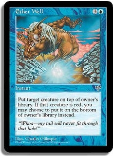 Put target creature on top of owner's library. If that creature is red, you may choose to put it on the bottom of owner's library instead.